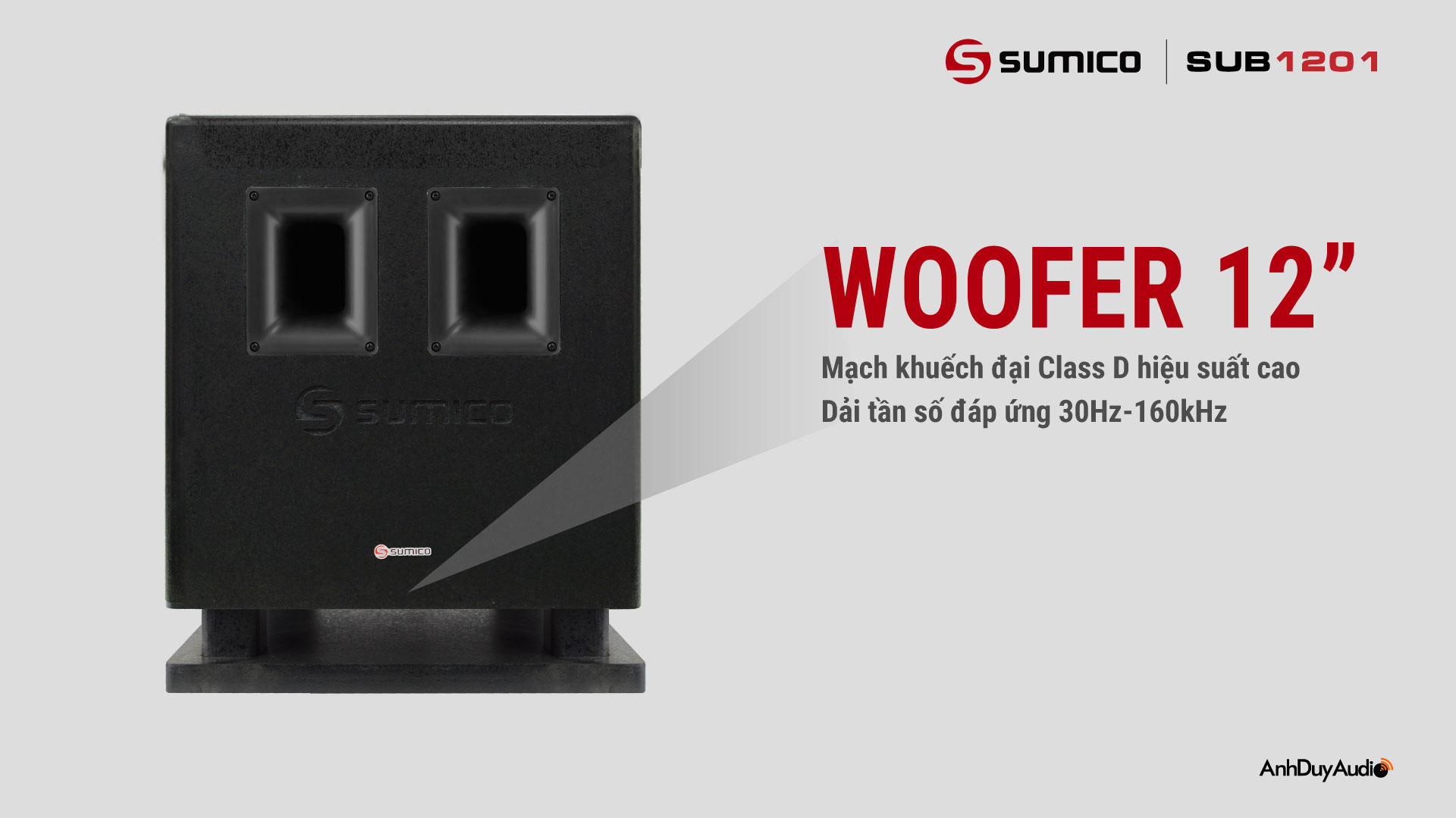 Sumico SUB1201 được trang bị Woofer công nghệ độc quyền của Sumico dùng màng loa sợi tổng hợp tinh chế đặc biệt có đường kính 12” (305mm) cùng mạch khuếch đại Class-D kỹ thuật mới cho công suất 250W RMS. Thùng loa sử dụng chất liệu gỗ MDF tỷ trọng cao, chắc nặng, sơn phủ nhám sần chống trầy xước và chống ấm, kết hợp hệ thống chân loa được thiết kế với kỹ thuật chống rung chuyên sâu. Mẫu loa Sumico SUB1201 được trang bị đầy đủ các chức năng của một Subwoofer: Điều chỉnh âm lượng, Cắt tần số, Phase, cổng kết nối ngõ vào và ngõ ra tín hiệu liên kết mở rộng.