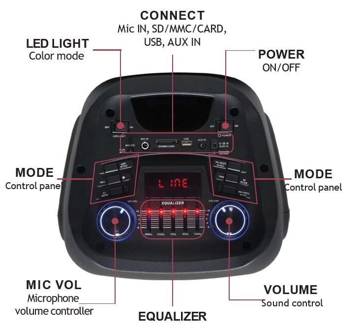 19.LED Display: Màn hình LED hiển thị đèn báo chức năng, nguồn phát nhạc đang kết nối (Bluetooth, AUX, USB…) và tình trạng Pin. tình trạng Pin.