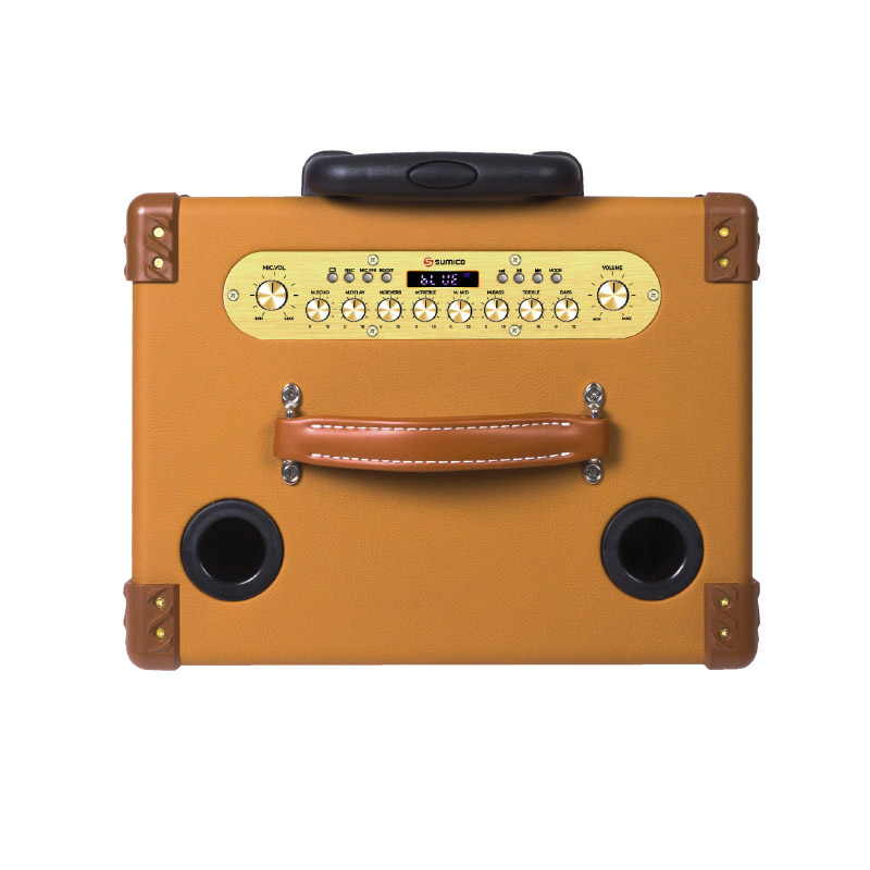 Vỏ thùng loa được bọc nhựa 8 góc để bảo vệ chống trầy móp, bề mặt thùng được phủ một lớp da cao cấp màu Cam Nâu đẹp mắt sang trọng nổi bật phối sắc tinh tế cùng màu Vàng Đồng của các nút chỉnh âm thanh và bảng ghi chú. Mặt lưới bằng chất liệu sợi tinh chế chọn lọc màu Đen, Nâu đan dệt xen kẽ tạo hiệu ứng bắt mắt và có tính thẩm mỹ cao, độ dày và khoảng cách sợi dệt được tính toán kỹ lưỡng để bảo vệ loa con bên trong mà vẫn đảm bảo đặc tính âm học. Thiết kế loa karaoke di động mang nét đẹp hoài cổ của Sumico Touring 12 tạo nên phong cách độc đáo, luôn sang trọng và cá tính dù sử dụng lâu dài qua nhiều năm.