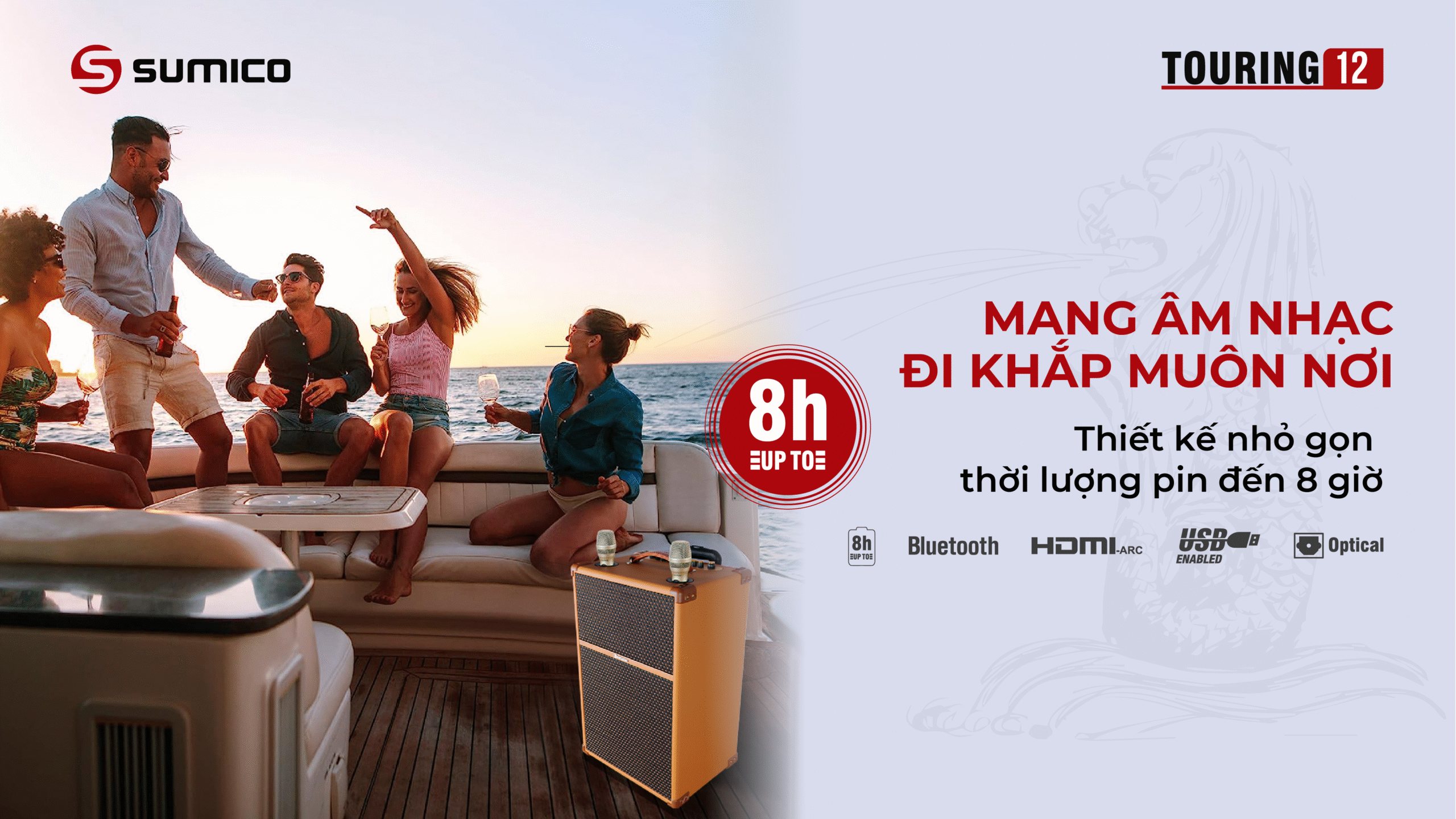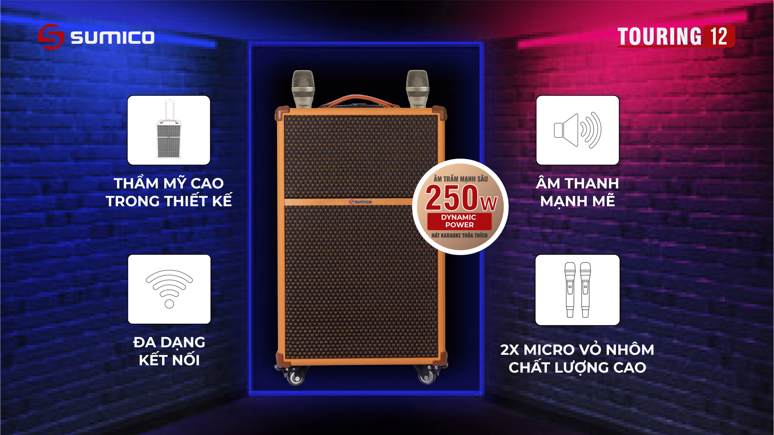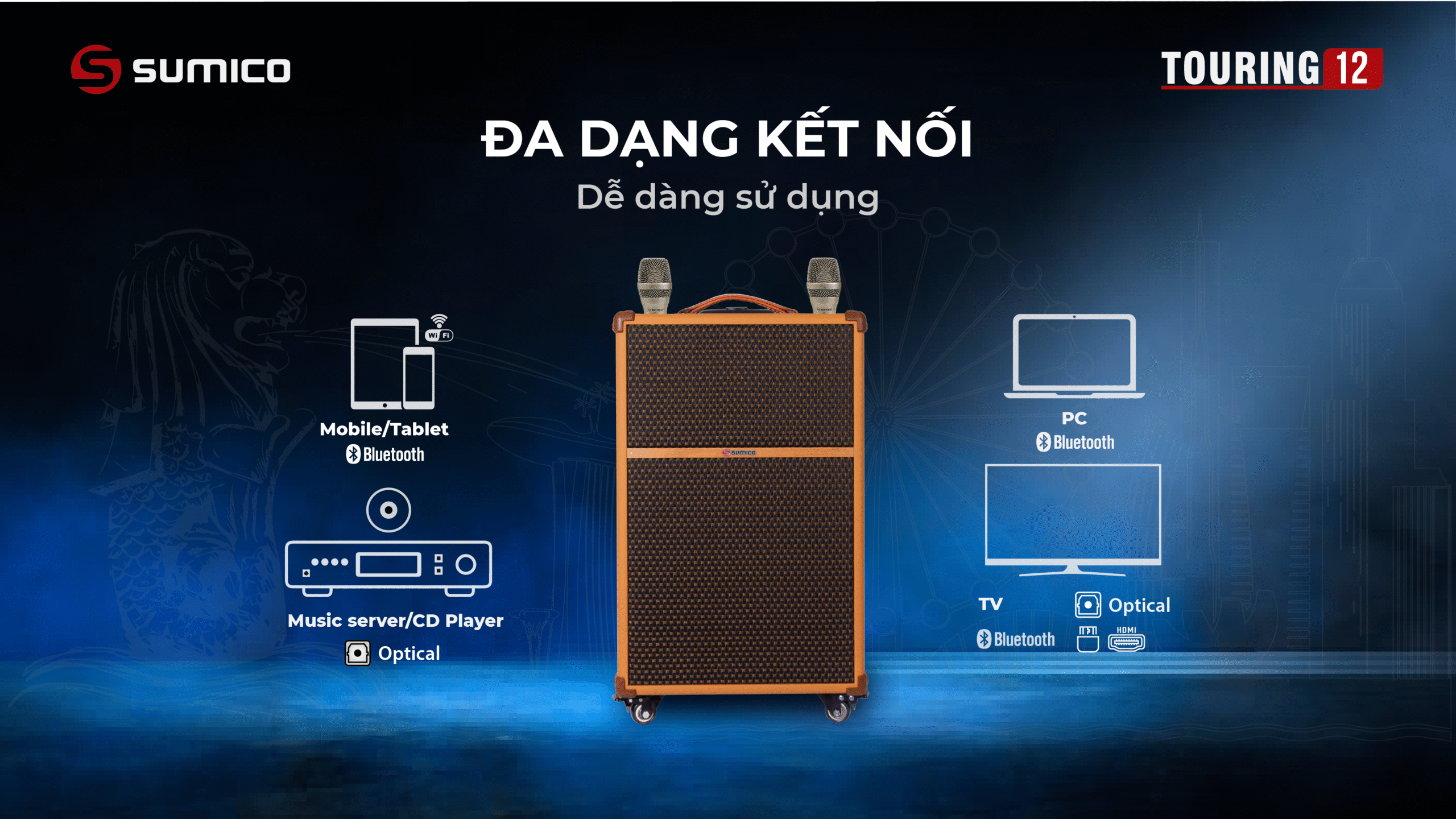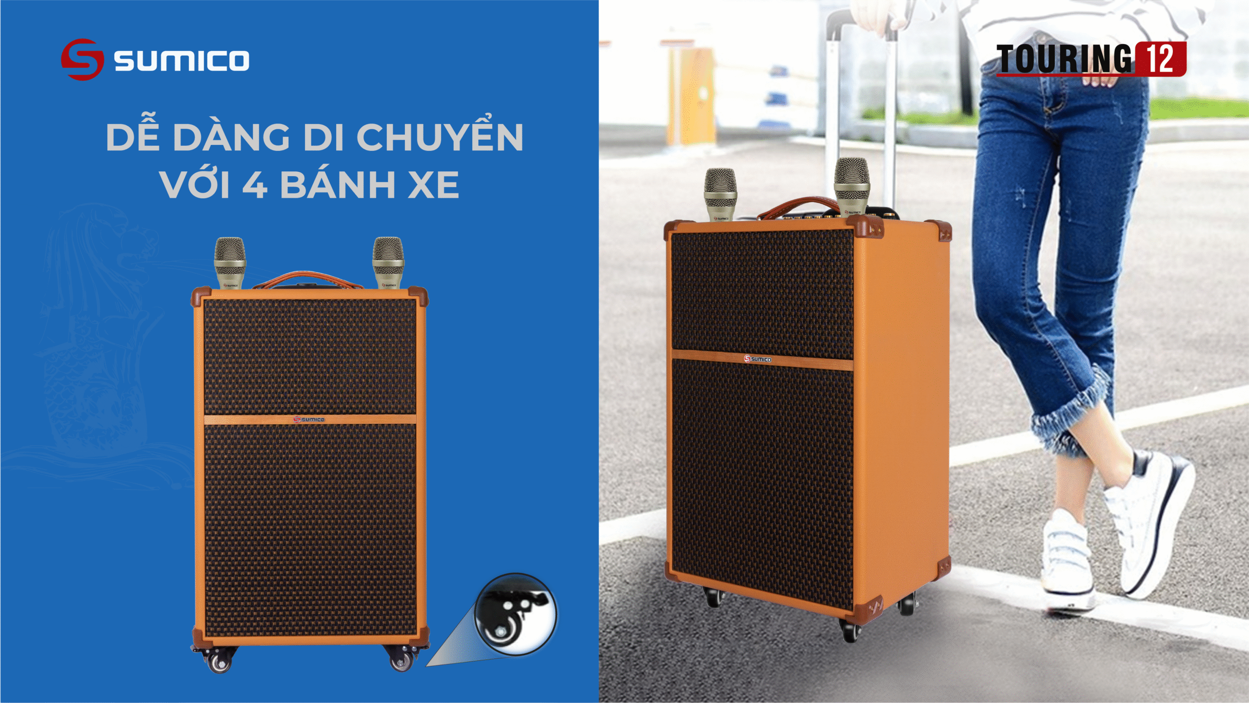 Sumico Touring 12 được thiết kế với tiêu chí hướng tới người dùng có yêu cầu cao về chất lượng âm thanh di động. Bạn có thể kéo loa di chuyển và đặt để vừa vặn thoải mái trong cốp xe hơi khi đi du lịch. Sản phẩm hữu dụng với cấu hình All In One, đầy đủ nhất cho nhu cầu giải trí di động mọi lúc mọi nơi cho những chuyến du lịch, vui tiệc tại homestay, resort: nghe nhạc, xem phim, hát karaoke, chơi đàn guitar hay các nhạc cụ khác.