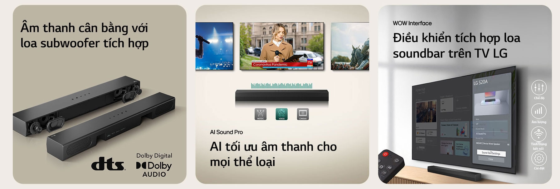 Loa LG Soundbar S20A được trang bị công nghệ AI Sound Pro giúp tự động tối ưu hóa âm thanh theo từng thể loại nội dung. Công nghệ này giúp phân tích thể loại âm thanh và điều chỉnh các chế độ như Music, Voice và Cinema, mang đến âm thanh phù hợp và chất lượng nhất cho từng loại nội dung.