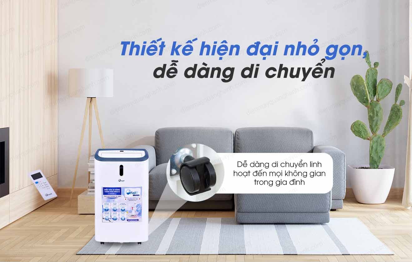 Điều hòa di động có thiết kế nhỏ gọn với kích thước là 762mm x 470mm x 353mm (cao x rộng x sâu) nên đặt trong phòng không tốn nhiều diện tích. Cục nóng và cục lạnh được tích hợp trên cùng 1 thiết bị nên nhìn rất gọn gàng, lắp đặt nhanh chóng và đơn giản (người dùng có thể tự lắp đặt mà không cần thuê thợ).