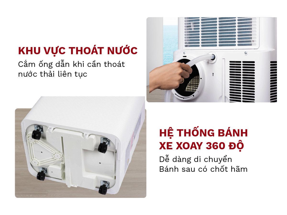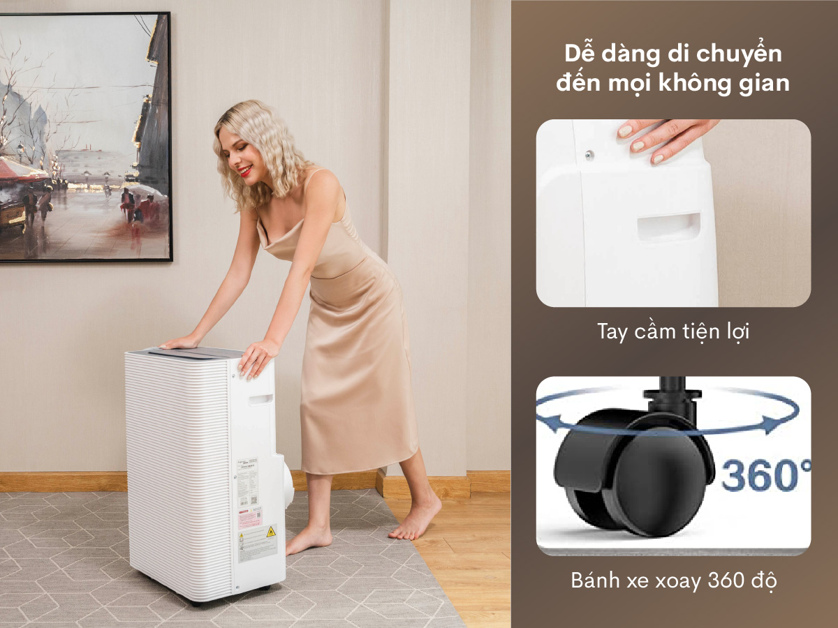 Thiết kế nhỏ gọn theo phong cách hiện đại, trang nhã, màu trắng thanh lịch đi phù hợp với không gian nội thất của các gia đình trẻ. Máy được trang bị hệ thống 4 bánh xe, giúp di chuyển linh hoạt tới bất kỳ địa điểm nào mà bạn muốn: Từ phòng khách, nhà bếp, phòng làm việc cho tới phòng ngủ.