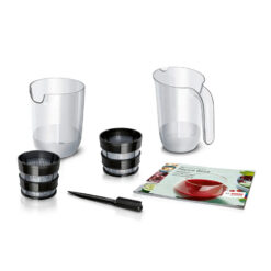Sản phẩm có đa dạng phụ kiện đi kèm như: 1 Cốc đựng nước trái cây, 1 Cốc đựng bã ép, 1 Bàn chải, 1 Bộ lọc thô, 1 Bộ lọc mịn và 1 Cuốn sách công thức để bạn có thể sáng tạo đa dạng các món nước ép trái cây.
