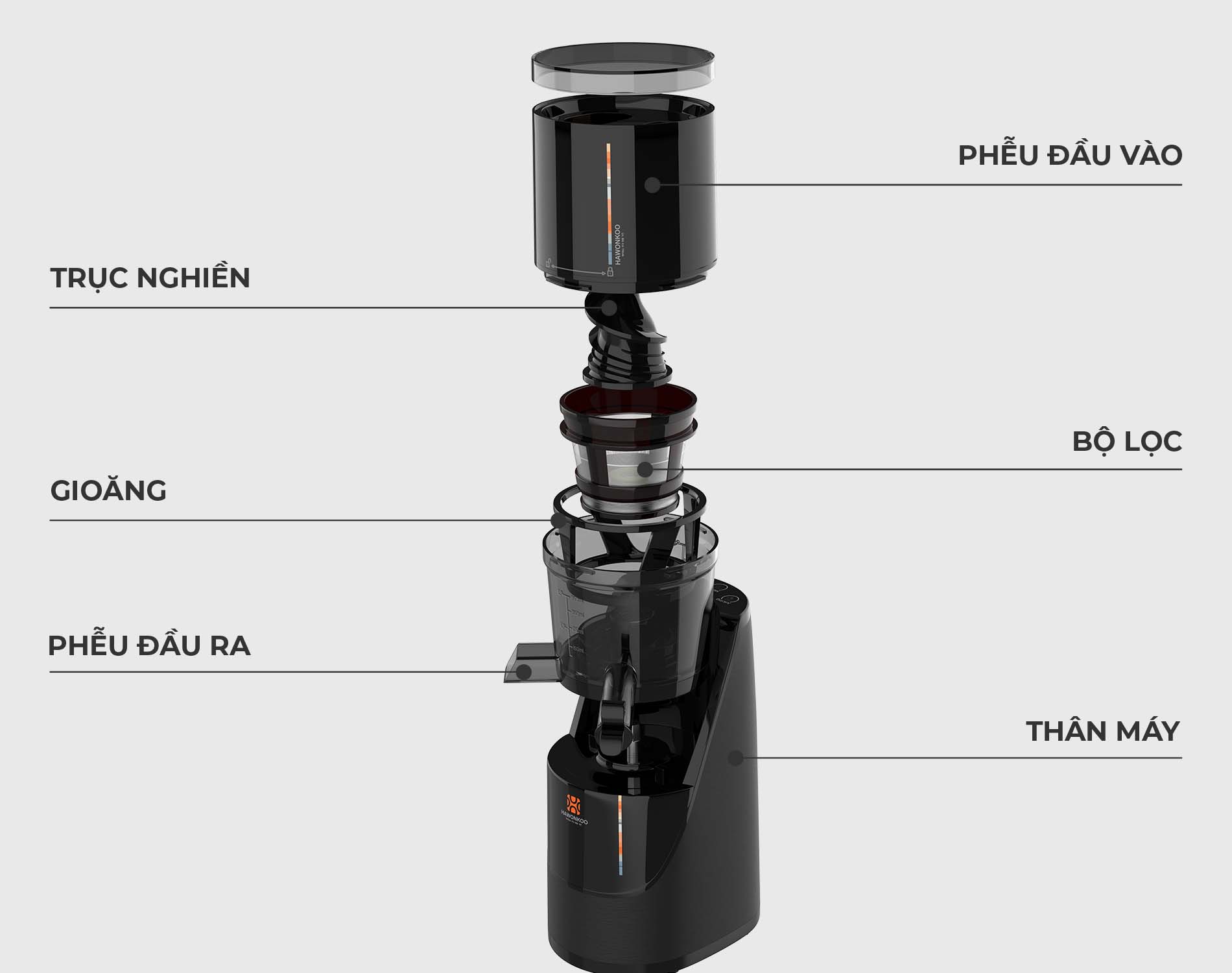 Trục nghiền cải tiến bằng nhựa cao cấp, công suất 200W mạnh mẽ kết hợp tính năng khuấy, đảo, trộn và chống kẹt, giúp ép hiệu quả các loại rau củ nhiều chất xơ và trái cây. Miệng máy ép 2 trong 1 “O Type Flap Gate” thế hệ mới, thiết kế cổ to với 2 cửa tiếp liệu giúp ép nhanh mà không cần dùng sức để đẩy trái cây, hạn chế mất chất dinh dưỡng.
