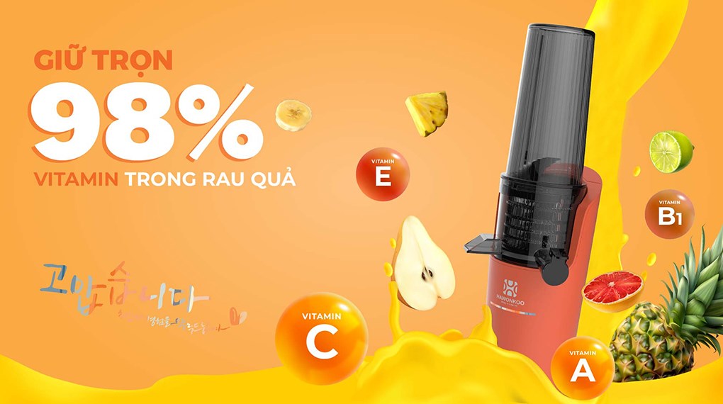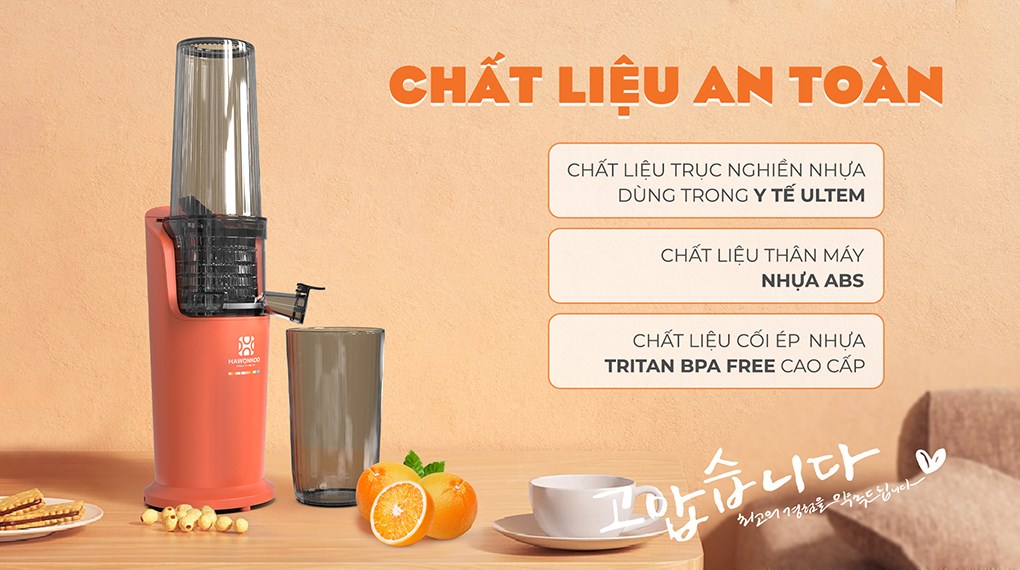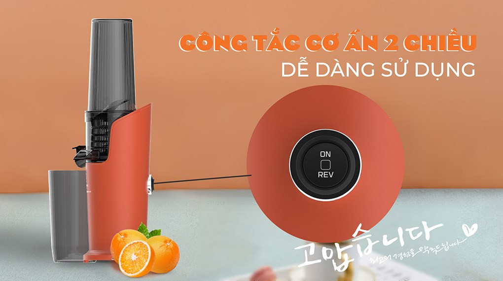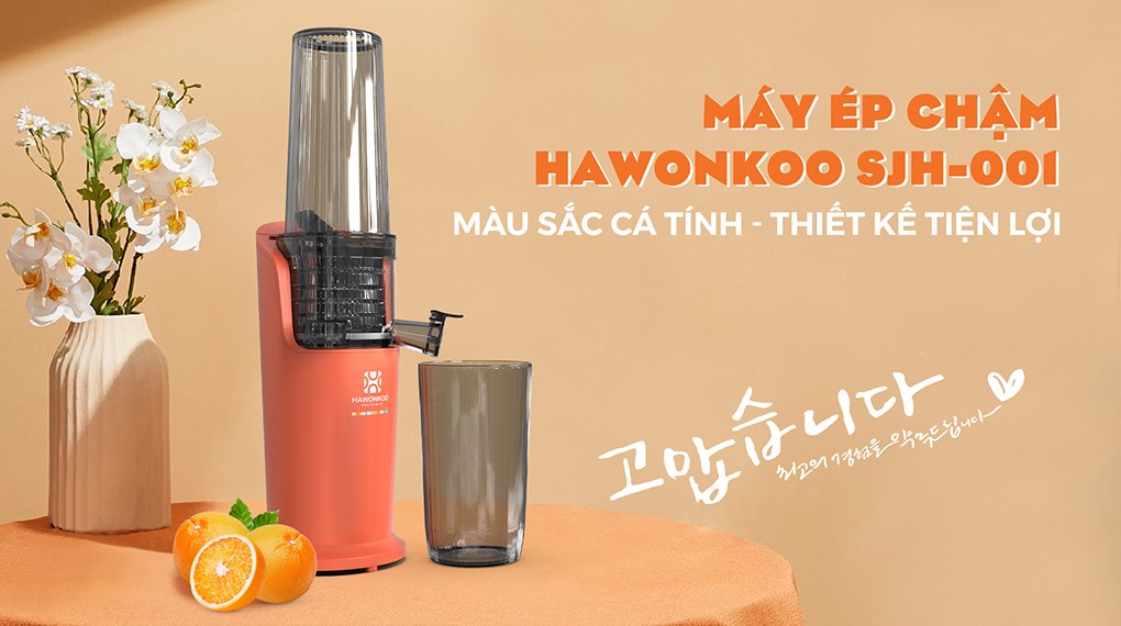 – Máy ép trái cây Hawonkoo chế tác gọn gàng, chắc chắn, gam màu cam nổi bật, tạo điểm nhấn thời thượng cho gian bếp gia đình.