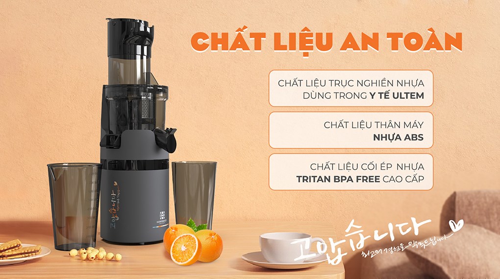 – Cối ép làm từ chất liệu nhựa Tritan không chứa BPA, cốc đựng nước ép và bã ép cũng làm từ nhựa Tritan không chứa BPA độ bền cao, chùi rửa đơn giản. Cốc đựng nước ép dung tích 0.8 lít chứa được nhiều nước ép cùng lúc.