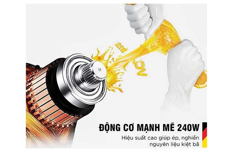 Máy ép trái cây sử dụng động cơ DC 1 chiều vận hành êm ái, giảm độ ồn và rung tối đa khi máy hoạt động. Công suất ép 240W, tốc độ 55 vòng/phút đảm bảo trái cây được ép kiệt bã.