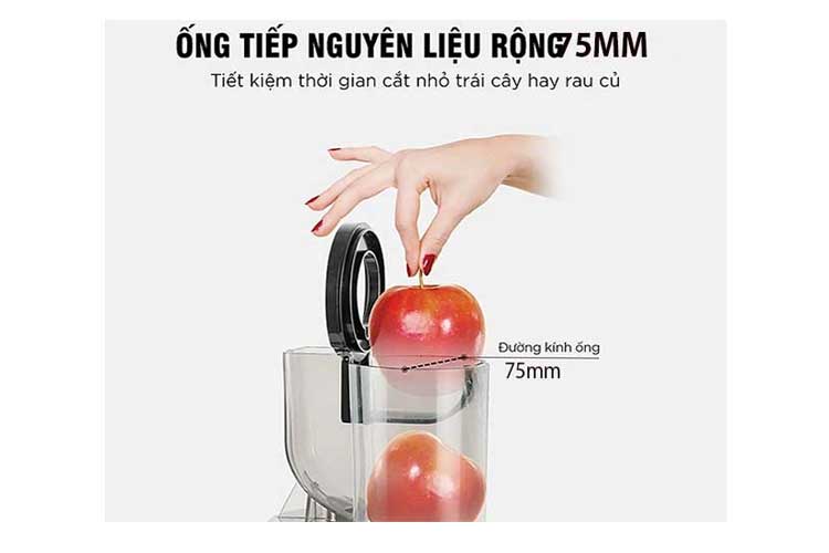 Ống tiếp nguyên liệu có đường kính tới 7.5cm giúp máy có khả năng ép quả nguyên trái như trái táo, cam, cà chua,… mà không cần tốn nhiều thời gian cắt nhỏ. Máy ép trái cây còn đi kèm một cây nhồi giúp bạn đưa nguyên liệu vào dễ dàng và nhanh chóng hơn.