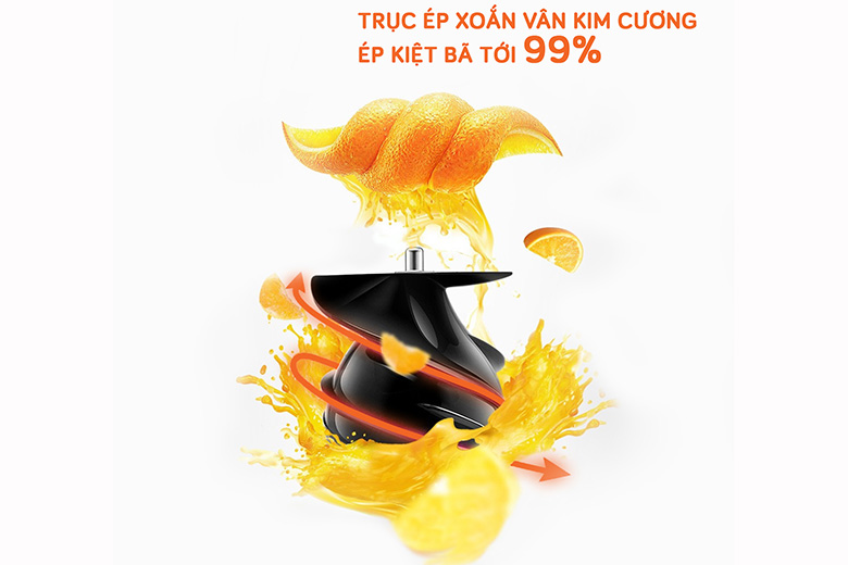 Máy ép sử dụng trục ép xoắn to bản vân kim cương để nghiền nhỏ và tách nước ra khỏi hoa quả. Trục ép đưa thực phẩm từ từ vào để nghiền nhuyễn, không sinh nhiệt trong quá trình ép, từ đó ép kiệt đến 99% bã và đảm bảo chất lượng nước ép sánh mịn, thu được lượng nước ép nhiều hơn 1.5 – 2 lần so với những loại máy ép thông thường.