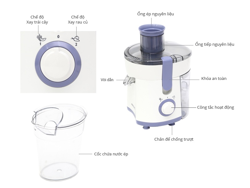 Máy ép trái cây được trang bị 2 tốc độ ép. Với tốc độ số 1 dùng để ép những loại trái cây mềm như: nho, dâu, cam… Tốc độ số 2 dùng để ép những loại trái cây cứng hơn như: táo, ổi, cà rốt…
