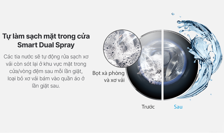 Máy giặt Aqua AQD-A1051G.S còn được trang bị Smart Dual Spray – chế độ tự làm sạch mặt trong cửa và vòng đệm cửa với tia nước, giúp tiết kiệm thời gian trong việc vệ sinh lồng giặt, hạn chế bụi bẩn thải ra bám lại trong quần áo qua nhiều lần sử dụng. Công nghệ steam wash giặt hơi nước của máy còn duy trì cho quần áo luôn mềm mại, giảm độ thô trong quá trình sấy khô.