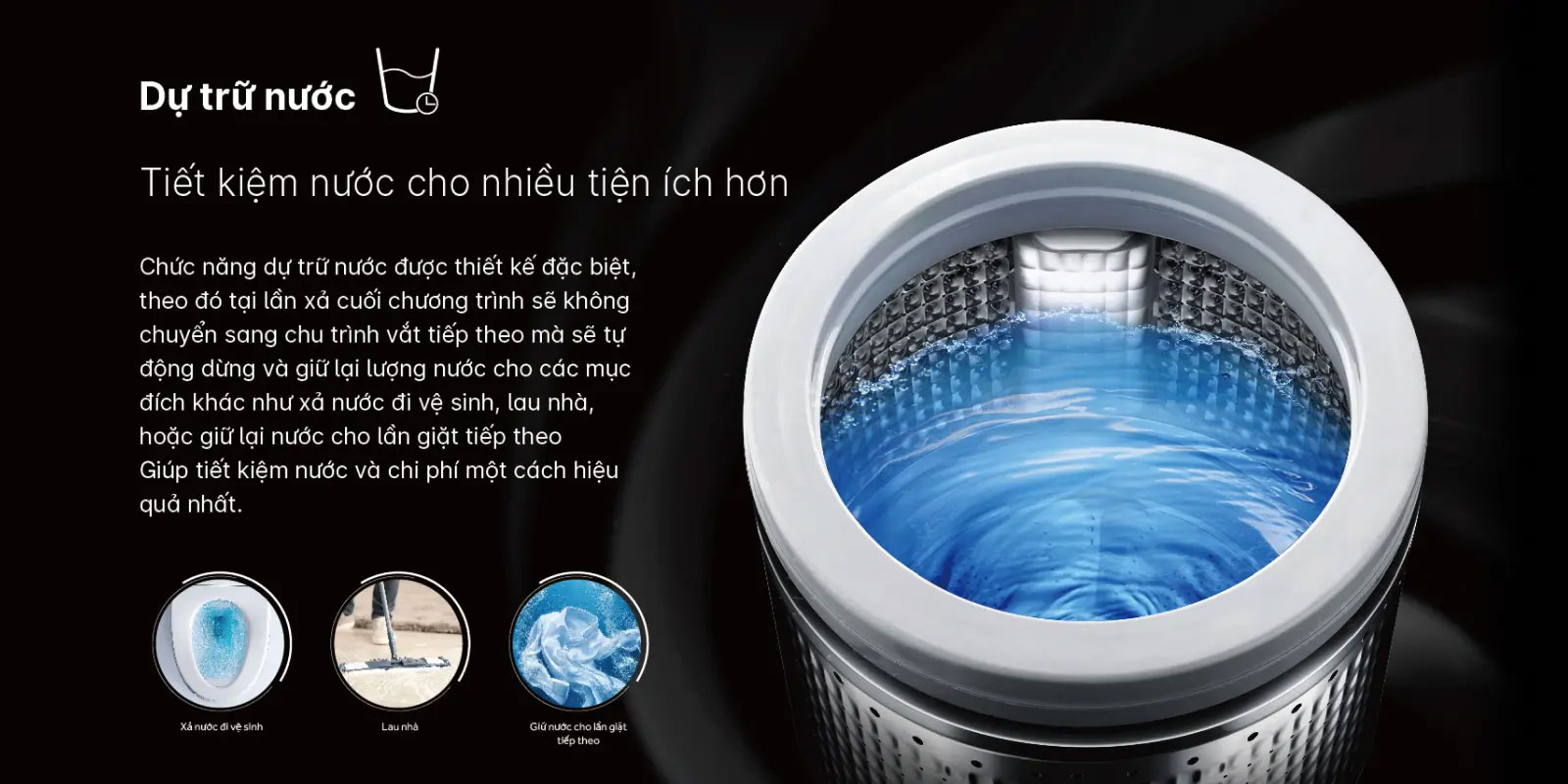 Dự trữ nước là một tính năng đặc biệt trên máy giặt lồng đứng AQUA AQW-FR100GT.BK. Với tính năng này, ngay tại lần xả cuối cùng chương trình sẽ không chuyển sang chu trình vắt tiếp theo mà máy sẽ tự động dừng lại và giữ lại lượng nước cho mục đích khác như lau nhà, đi vệ sinh hoặc giữ lại nước cho lần giặt tiếp theo. Nhờ vậy, bạn có thể tiết kiệm nước và chi phí một cách hiệu quả.
