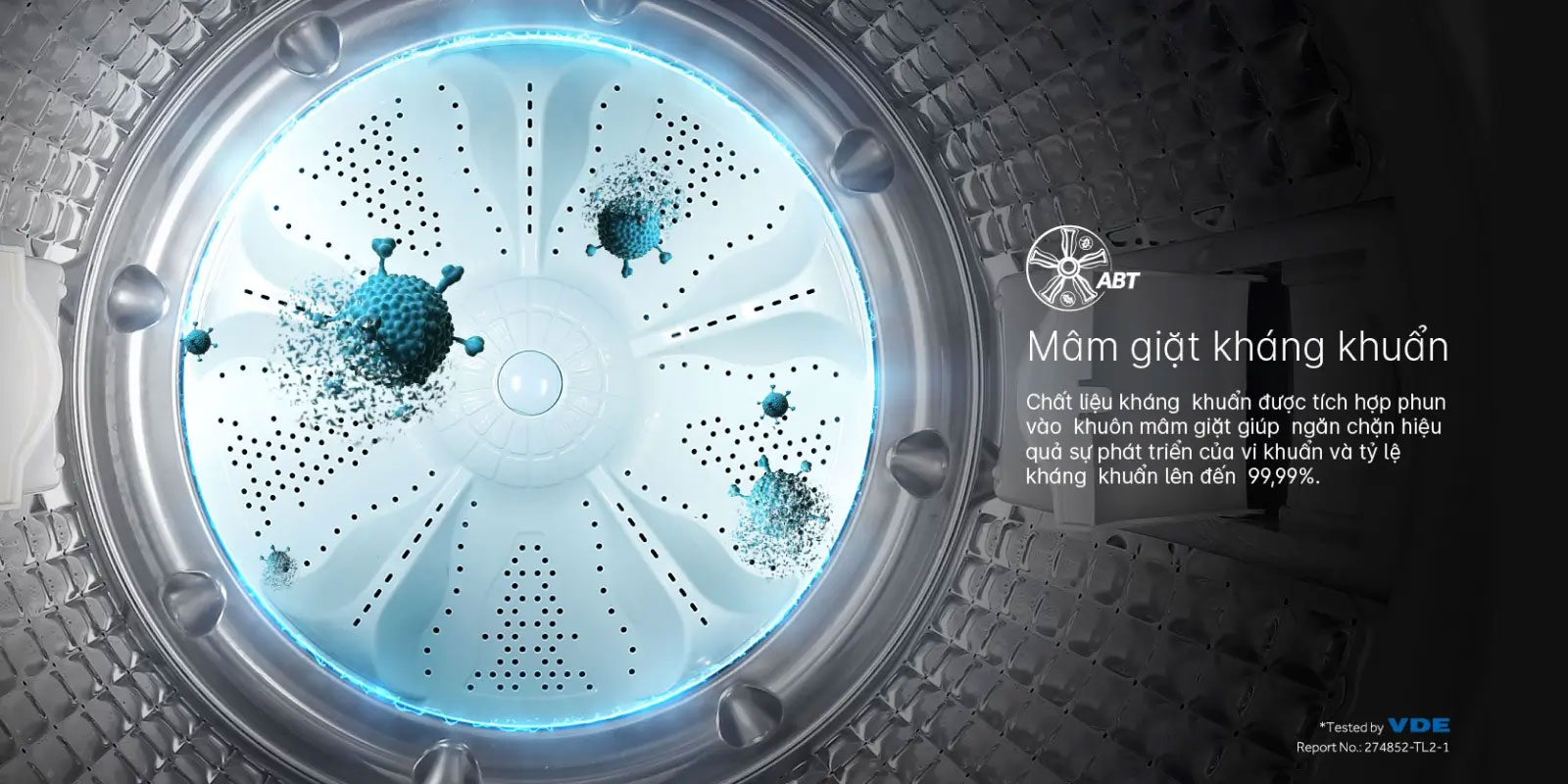 Hầu hết các model máy giặt AQUA hiện nay, trong đó có model máy giặt AQUA AQW-FR100GT.BK, đều được trang bị mâm giặt ABT. Mâm giặt này được làm bằng chất liệu kháng khuẩn có khả năng ngăn chặn sự phát triển của vi khuẩn, nấm mốc với hiệu quả lên đến 99,99%. Nhờ đó, quần áo sau khi giặt sẽ luôn sạch sẽ, an toàn. Tính năng này đặc biệt hữu ích khi gia đình có trẻ nhỏ hoặc người có làn da nhạy cảm.