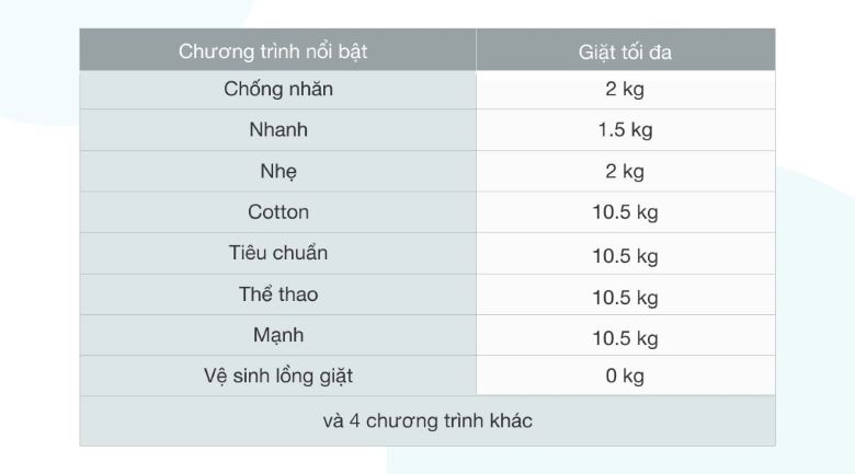 12 chương trình giặt được tích hợp sẵn, đáp ứng tốt nhu cầu giặt giũ của của gia đình