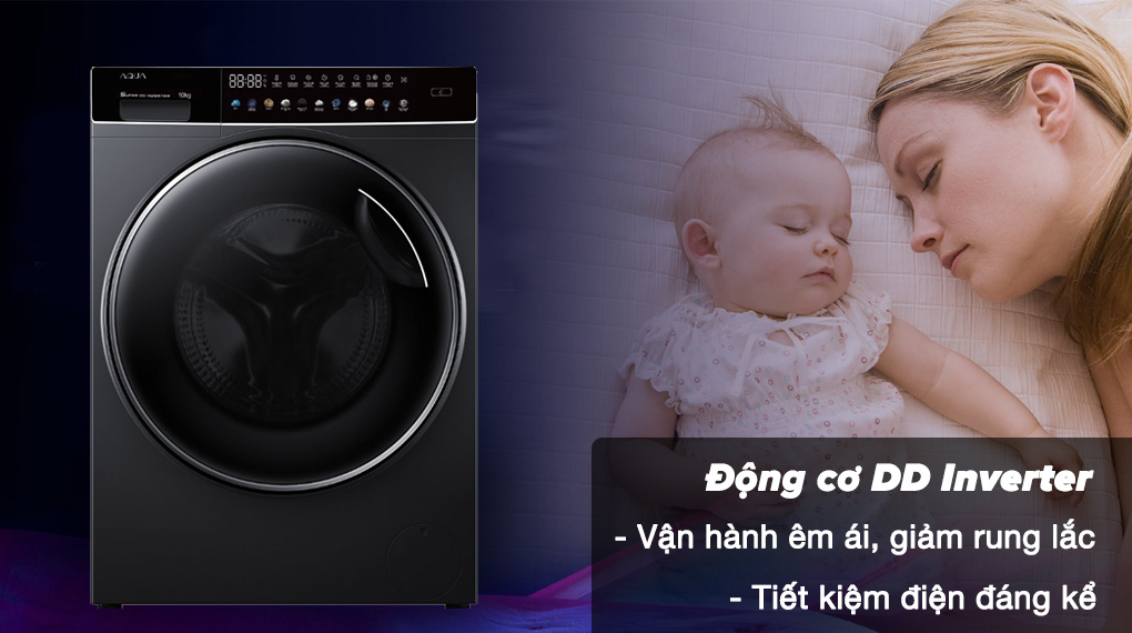 – Động cơ DD Inverter: Giúp cho máy giặt Aqua đạt hiệu quả giặt sạch tối ưu mà vẫn đảm bảo tiêu chí vận hành êm ái, giảm thiểu tình trạng rung lắc trong suốt chu trình giặt và tiết kiệm điện năng đáng kể.