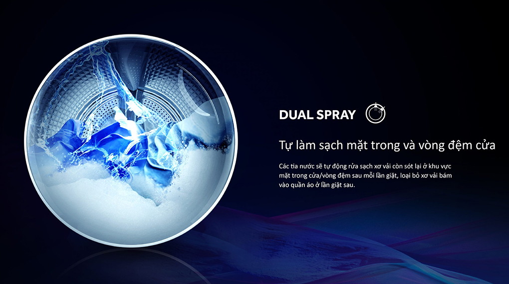 – Smart Dual Spray giúp loại bỏ xơ vải, mảng bám ở mặt trong cửa và vòng đệm sau mỗi lần giặt.
