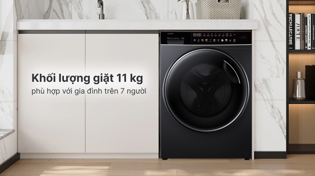 – Máy giặt có khối lượng giặt là 11 kg đáp ứng cho nhu cầu giặt giũ của gia đình có trên 7 thành viên.
