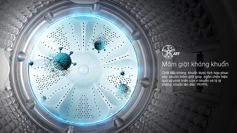 Trên khuôn mâm giặt được tích hợp phun chất liệu kháng khuẩn có khả năng ngăn chặn sự phát triển của vi khuẩn, đạt hiệu quả lên đến 99.99%.