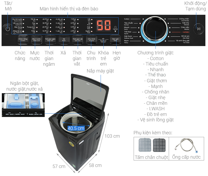 • Chăn mền Chương trình I-Wash Chống nhăn Giặt mạnh Giặt nhanh Giặt nhẹ Giặt thơm Giặt tiêu chuẩn Vệ sinh lồng giặt Đồ cotton Đồ thể thao Đồ trẻ em
