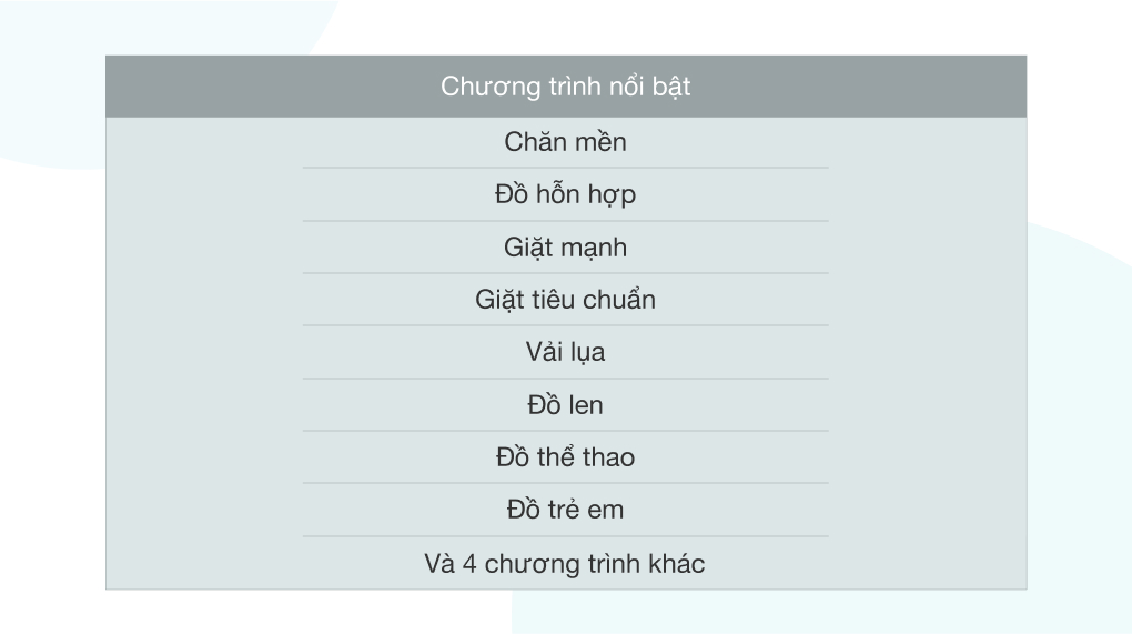 – 12 chương trình giặt giũ được tích hợp sẵn phù hợp với nhiều nhu cầu giặt giũ khác nhau: Giặt tiêu chuẩn, giặt nhanh, giặt chăn mền, chống nhăn, đồ thể thao,… (xem thêm tại bảng thông số kỹ thuật). Chương trình giặt nhanh thích hợp cho các loại quần áo mỏng, ít bẩn cần làm sạch nhanh để sử dụng.