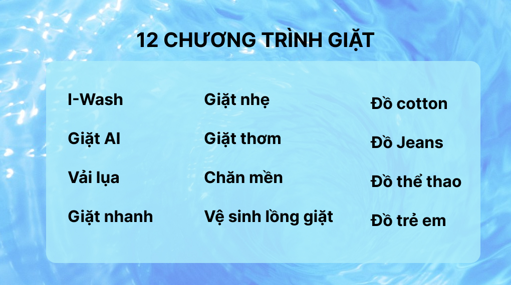 – 12 chương trình giặt, phù hợp với nhiều loại quần áo, nhu cầu và chất liệu vải. Cụ thể là: I-Wash, chăn mền, giặt AI, vải lụa, giặt nhanh, giặt nhẹ, giặt thơm, đồ cotton, đồ Jeans, đồ thể thao, đồ trẻ em, vệ sinh lồng giặt.