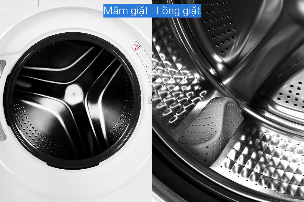 không gian lồng giặt lớn lên đến 52.5 cm, được gia công với công nghệ hàn laser tiên tiến, không có gờ và mối nối giúp giặt sạch hơn, giảm xoắn rối cho quần áo.