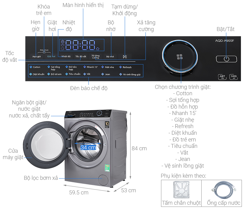 Máy giặt Aqua thiết kế ảng điều khiển kết hợp các dạng nút cảm ứng, nút xoay và màn hình hiển thị điện tử giúp người dùng dễ dàng lựa chọn các chương trình giặt phù hợp như: refresh, diệt khuẩn, giặt nhanh 15 phút, sợi tổng hợp, tiêu chuẩn, đồ hỗn hợp, cotton, vệ sinh lộng giặt,… (Xem thêm chi tiết tại bảng TSKT)