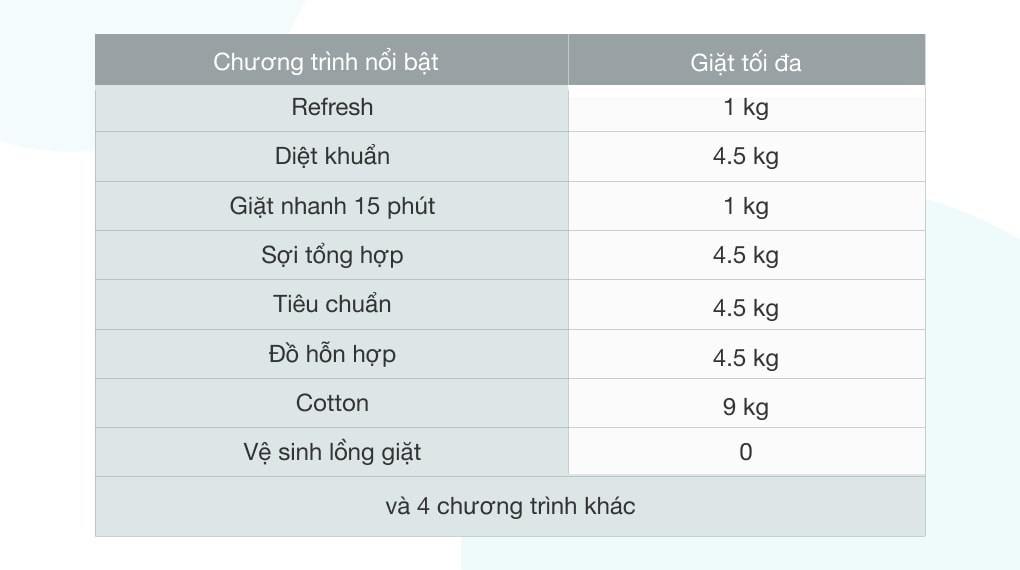 Mỗi chương trình sẽ có công dụng riêng, người dùng có thể chọn chương trình diệt khuẩn để giặt các loại quần áo cần bảo an toàn như quần áo trẻ em, khăn tắm.
