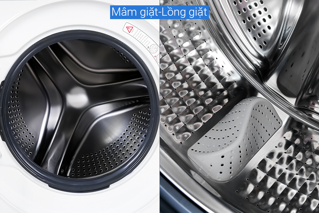 Lồng giặt của máy làm từ vật liệu thép không gỉ, có thiết kế hình dạng gối Pillow với các lỗ thoát nước có kích thước nhỏ, tạo ra những tia nước phun mạnh mẽ, không chỉ làm tăng hiệu quả giặt giũ mà quần áo cũng được bảo vệ tốt hơn, tránh hư tổn sợi vải.