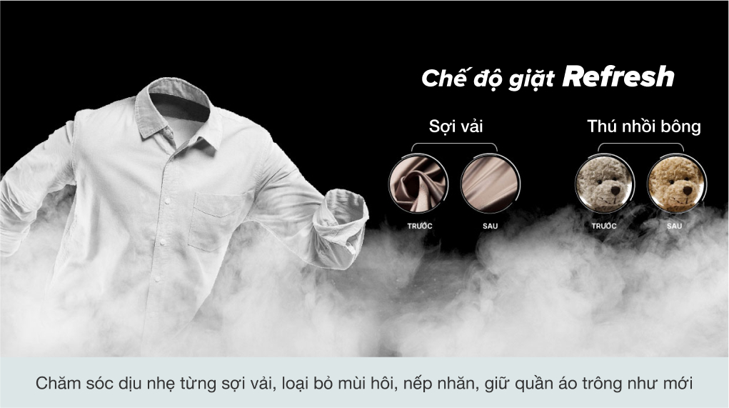 – Giặt hơi nước: hơi nước và bột giặt được khuếch tán bên trong lồng giặt ở nhiệt độ 60°C đến 90°C giúp thẩm thấu vào quần áo tốt hơn, nhanh chóng loại bỏ các vết bẩn cứng đầu, đồng thời giúp loại bỏ vi khuẩn và các chất gây dị ứng, an toàn cho da nhạy cảm.