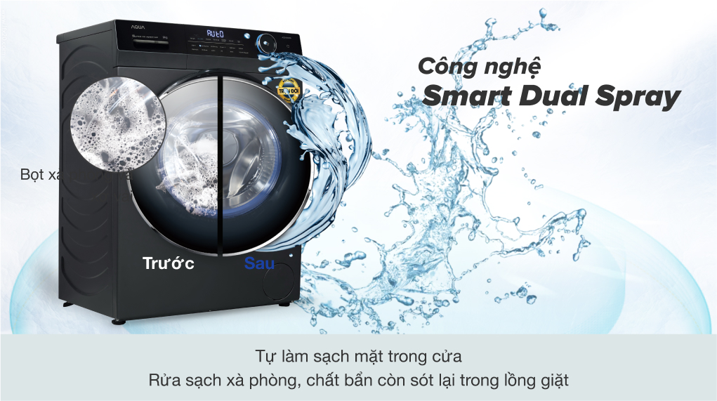 – Công nghệ Smart Dual Spray tự làm sạch mặt trong cửa hạn chế xơ vải bám vào quần áo ở lần giặt sau nhờ các tia nước tự động rửa sạch xơ vải còn sót lại ở khu vực mặt trong cửa/vòng đệm sau mỗi lần giặt.