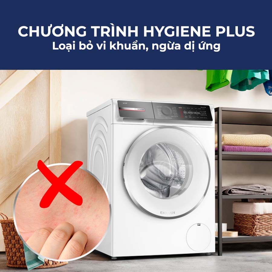 Máy giặt Bosch WGB256A90 được trang bị tính năng Hygiene Plus, lý tưởng cho việc giặt quần áo của trẻ nhỏ và những người có làn da nhạy cảm dễ bị dị ứng. Khi sử dụng chương trình giặt Hygiene Plus, nhiệt độ của nước giặt được duy trì từ 40℃ đến 60℃, cùng với số lần xả tăng thêm.