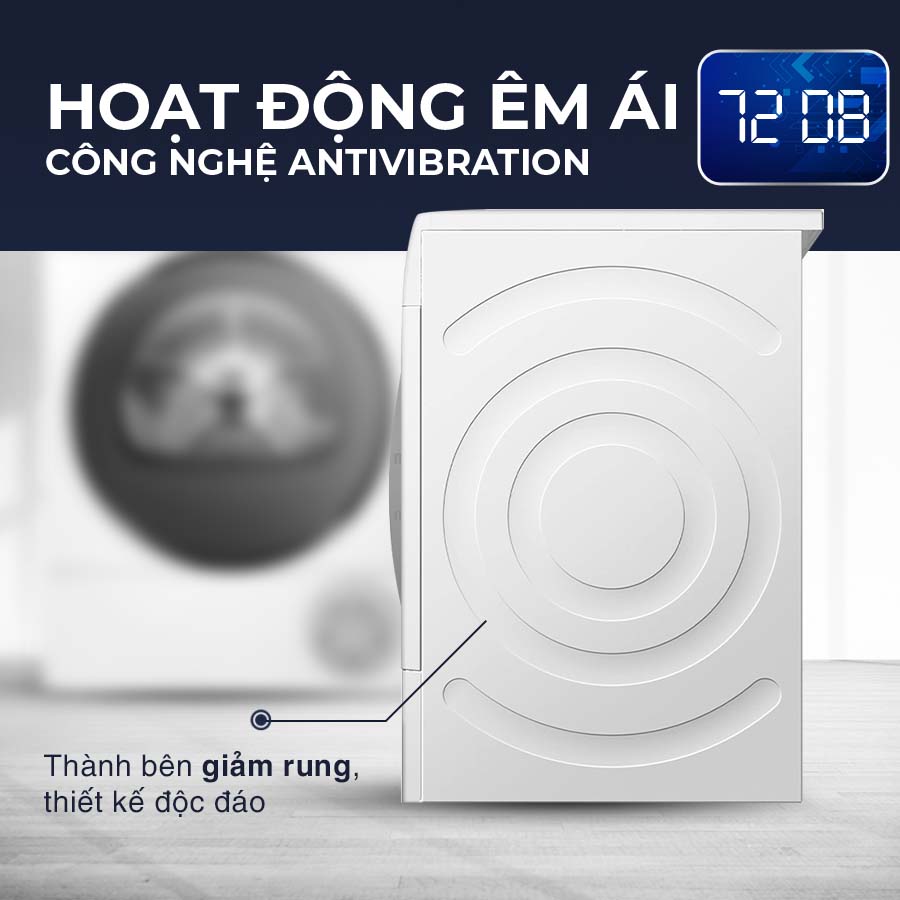 Máy giặt Bosch WGB256A90 được trang bị công nghệ AntiVibration, hiệu quả khi giảm tiếng ồn xung quanh lồng máy. Với trang bị 2 lớp cách nhiệt 2 bên được tăng cường, nhờ đó độ ồn được giảm xuống ổn định, mang lại khả năng giặt êm ái và yên tĩnh.