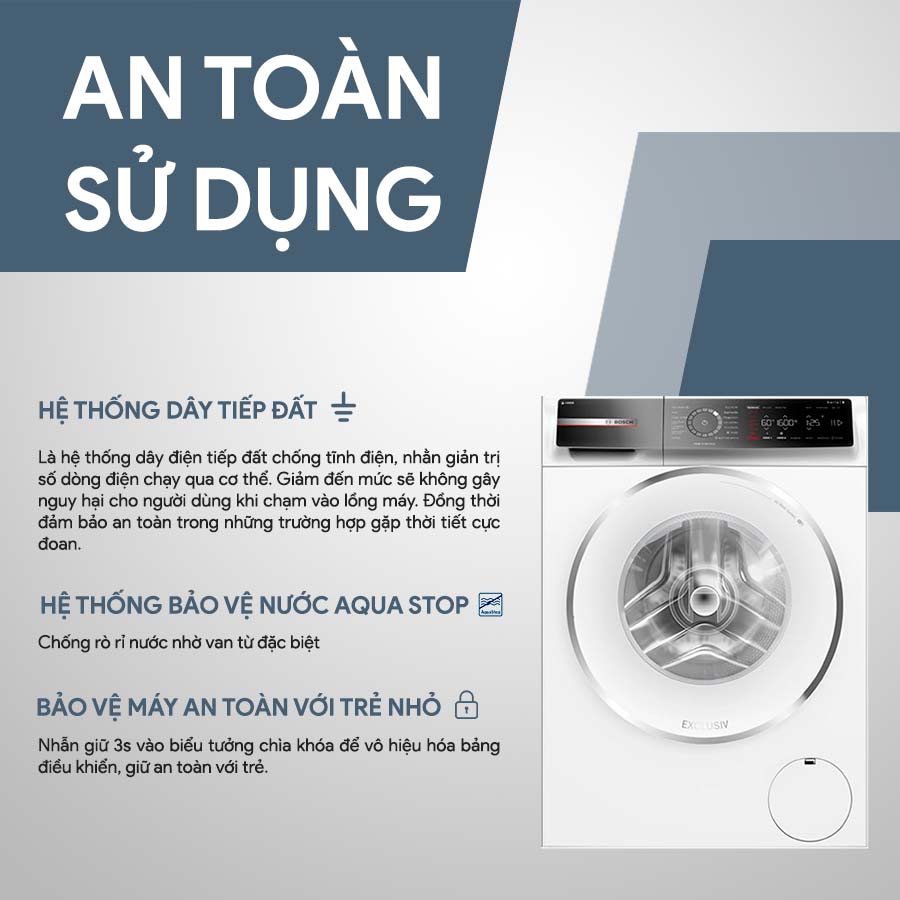 Máy giặt Bosch WGB256A90 được trang bị các tính năng an toàn để bảo vệ người dùng và các thiết bị như sau:
