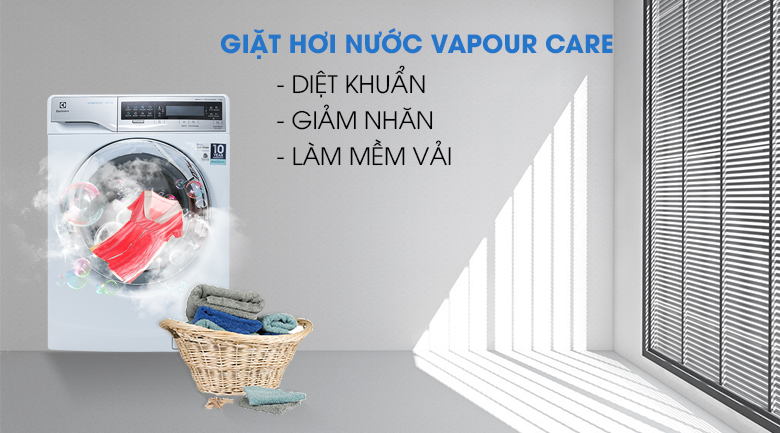Máy giặt Electrolux EWF14113 được trang bị công nghệ giặt hơi nước Vapour Care giúp giặt sạch cả những vết bẩn bám chặt trên quần áo, giảm thiểu 99,9% vi khuẩn và các tác nhân gây dị ứng, mẩn ngứa trên quần áo, quần áo của gia đình bạn sẽ luôn luôn sạch sẽ và được bảo vệ tối đa.