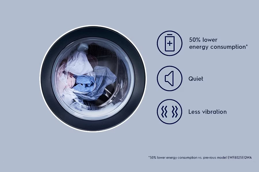 Động cơ EcoInverter giúp máy giặt hoạt động êm ái, giảm độ rung lắc, tiết kiệm tới hơn 50% điện năng tiêu thụ so với các dòng sản phẩm truyền thống*. Bảo hành 10 năm dành cho động cơ.*Tiết kiệm hơn 50% điện năng, khi so EWF8024BDWA với model cũ EWF8025EQWA
