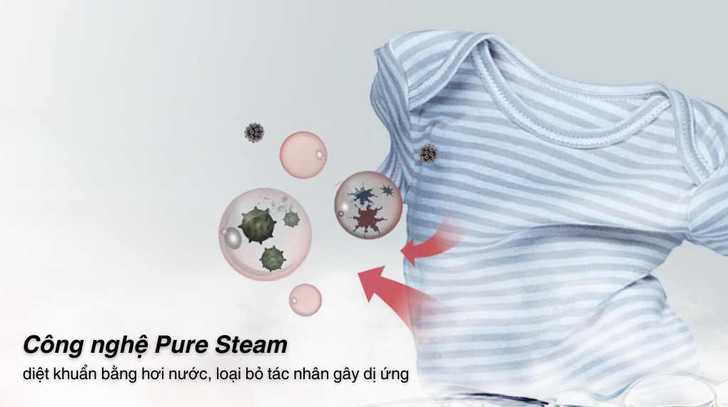 – Công nghệ Pure Steam được sử dụng ở giai đoạn cuối để khử mùi và diệt khuẩn, hỗ trợ giảm nhăn và bảo vệ sợi vải, đặc biệt hữu ích khi giặt đồ trẻ em hoặc quần áo cần chăm sóc đặc biệt.