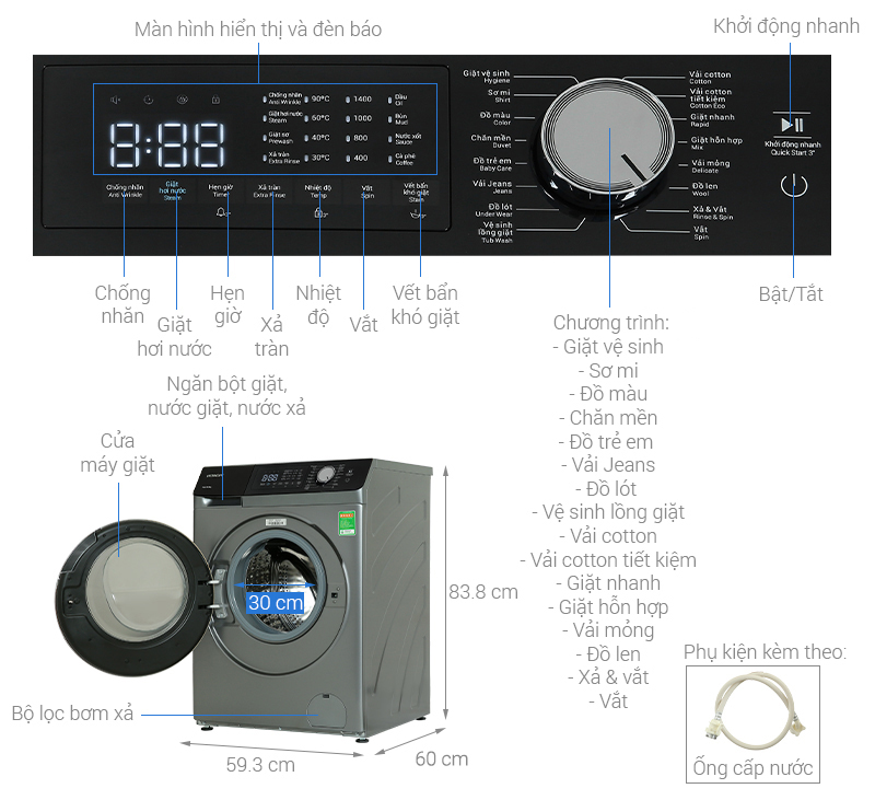 • Tiện ích: Vệ sinh lồng giặt Khóa trẻ em Hẹn giờ giặt Chống nhăn