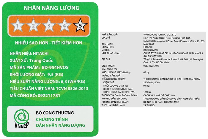 Máy giặt Hitachi Inverter 9.5 kg BD-954HVOS có khối lượng giặt lên đến 9.5 kg, thích hợp với các gia đình từ 5 – 7 người. Máy sở hữu nhiều công nghệ nổi bật như công nghệ tiết kiệm điện năng Inverter, công nghệ giặt hơi nước diệt khuẩn. Không chỉ vậy, công nghệ Inverter của máy còn mang đến khả năng tiết kiệm điện hiệu quả và vận hành êm ái, giúp cho việc giặt giũ của gia đình bạn được thuận tiện và dễ dàng hơn.