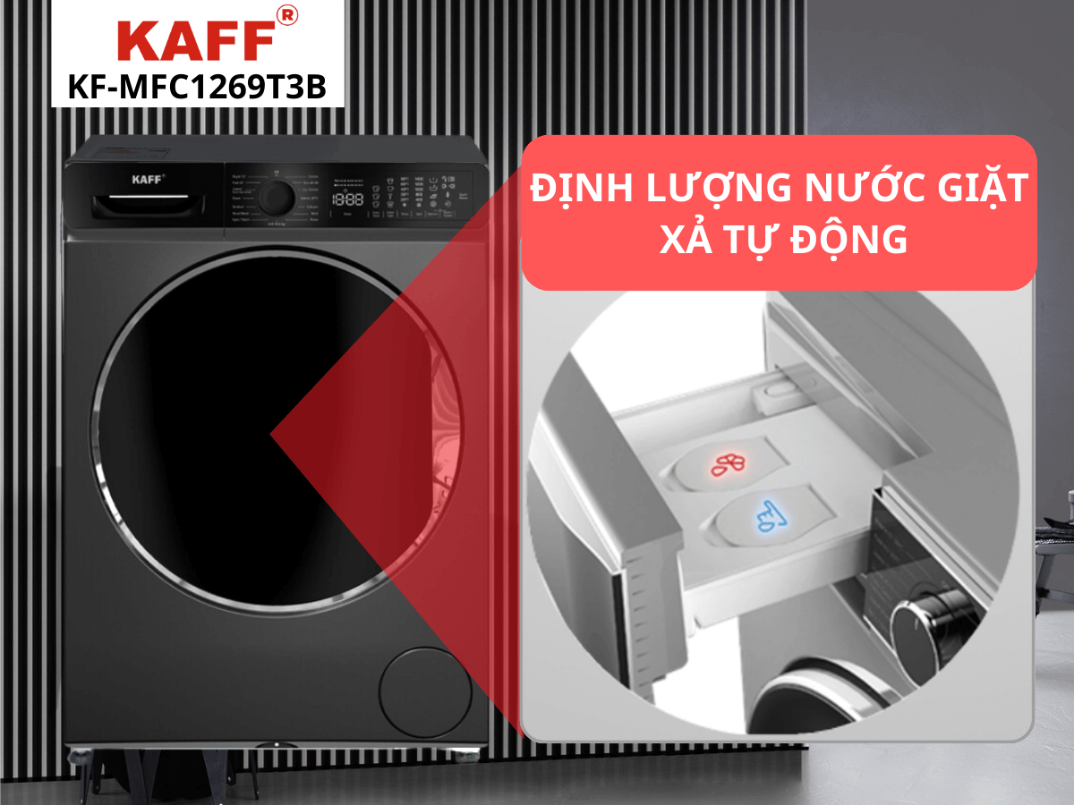 Máy giặt Kaff KF-MFC1062T3B áp dụng công nghệ định lượng nước giặt xả tự động thông minh. Cụ thể, bạn chỉ cần đổ đầy nước giặt và xả vào ngăn chứa một lần, và mỗi lần giặt, máy sẽ tự động phát hiện khối lượng quần áo và chất liệu vải để từ đó tính toán chính xác lượng nước giặt xả cần dùng để đảm bảo hiệu quả giặt sạch và tránh lãng phí.