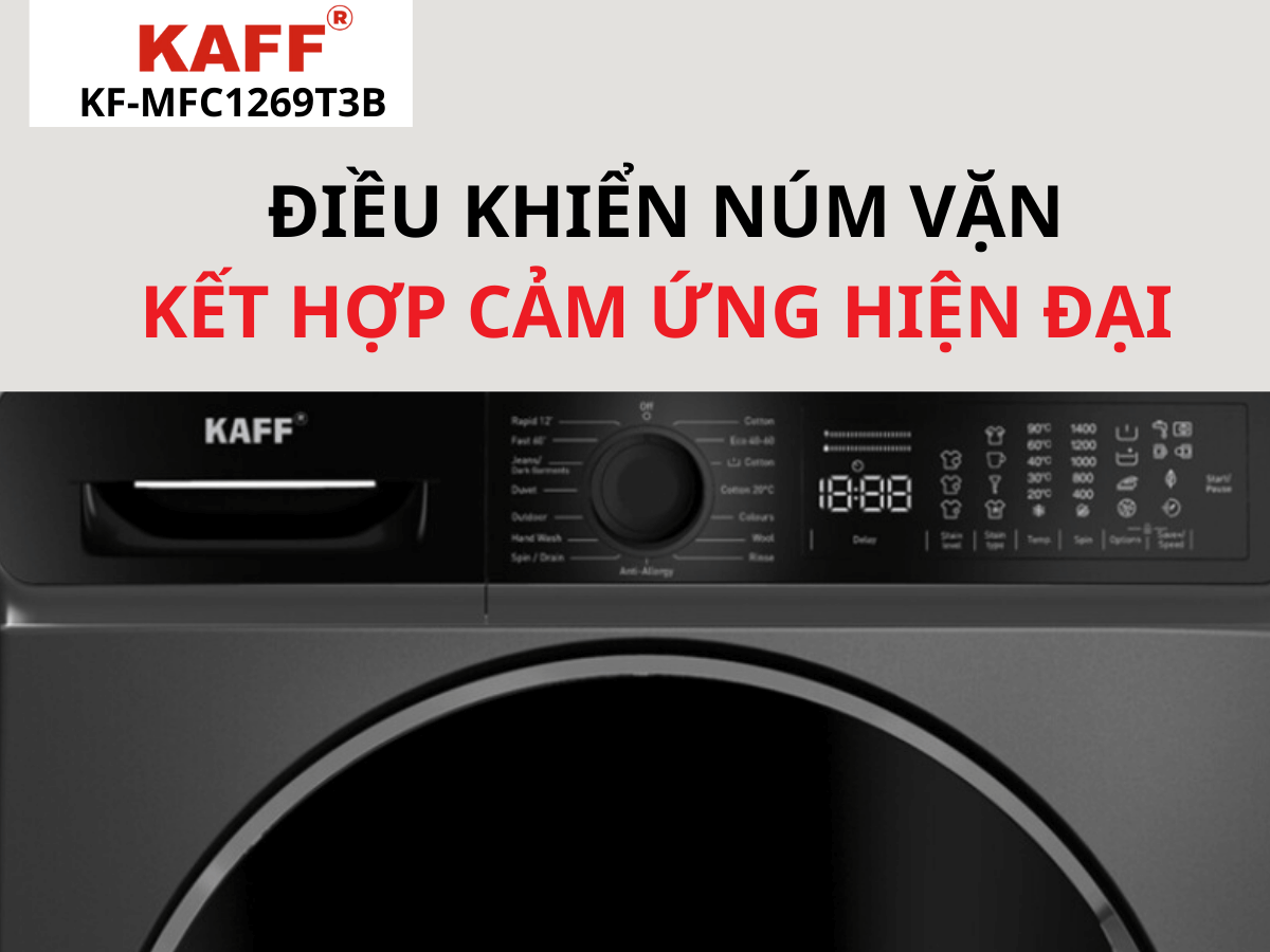 Máy giặt Kaff KF-MFC1062T3B được trang bị hệ thống điều khiển thông minh bằng cả cảm ứng và núm xoay tiện lợi. Người dùng dễ dàng lựa chọn các chương trình giặt cơ bản bằng cách xoay nhẹ núm vặn, và lựa chọn các chức năng nâng cao thông qua thao tác chạm nhẹ trên màn hình cảm ứng. Cùng với màn hình LED hiển thị trực quan, sắc nét thông tin hoạt động của máy, giúp người dùng dễ dàng theo dõi và sử dụng máy tiện lợi. Hệ thống điều khiển thông minh, hiện đại này giúp tối ưu trải nghiệm người dùng.