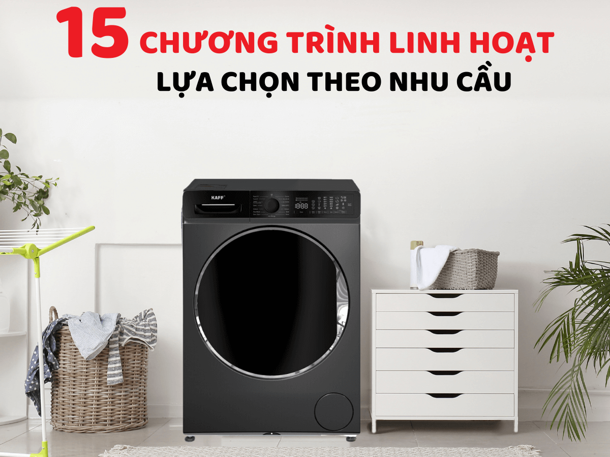 Máy giặt Kaff KF-MFC1269T3B được trang bị 15 chương trình giặt đa dạng đáp ứng mọi nhu cầu của gia đình. Cụ thể máy hỗ trợ các chế độ giặt thông dụng như ECO 40-60, Cotton, Cotton prewash, Cotton 20°C, Colours, Synthetics, Wool, Duvet, Rinse, Allergy Safe, Spin/Drain, Hand wash/Delicate, Rapid 12 min, Fast 60′ 60°C, Jeans… đáp ứng tốt cho các loại vải khác nhau. Đặc biệt là chế độ giặt nhanh chỉ 12 phút giúp người dùng tiết kiệm tối đa thời gian mà vẫn đảm bảo hiệu quả làm sạch cao.