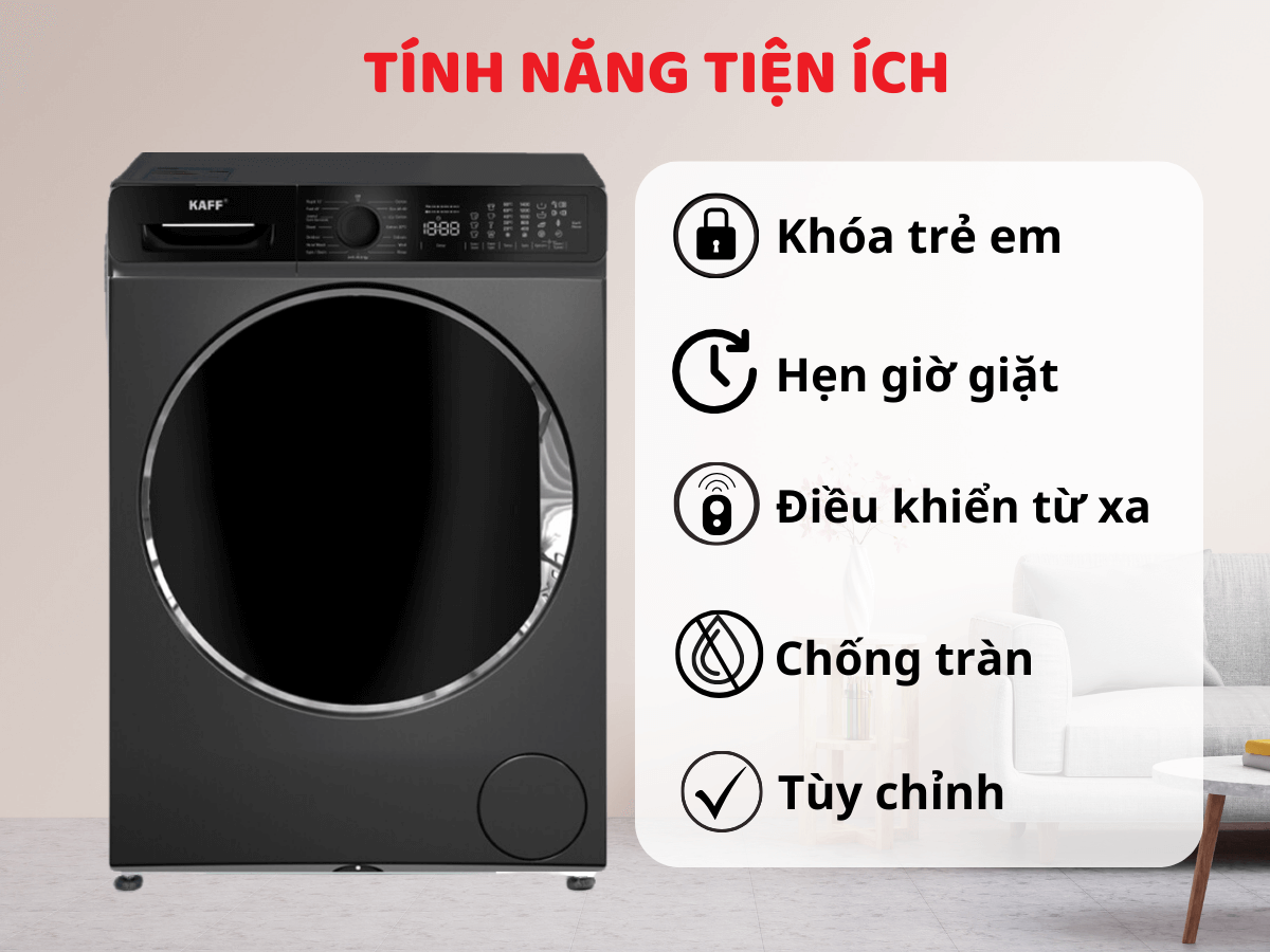 – Điều khiển từ xa: kết nối với thiết bị di động qua kết nối wifi, cho phép điều khiển máy giặt từ xa vô cùng tiện lợi.