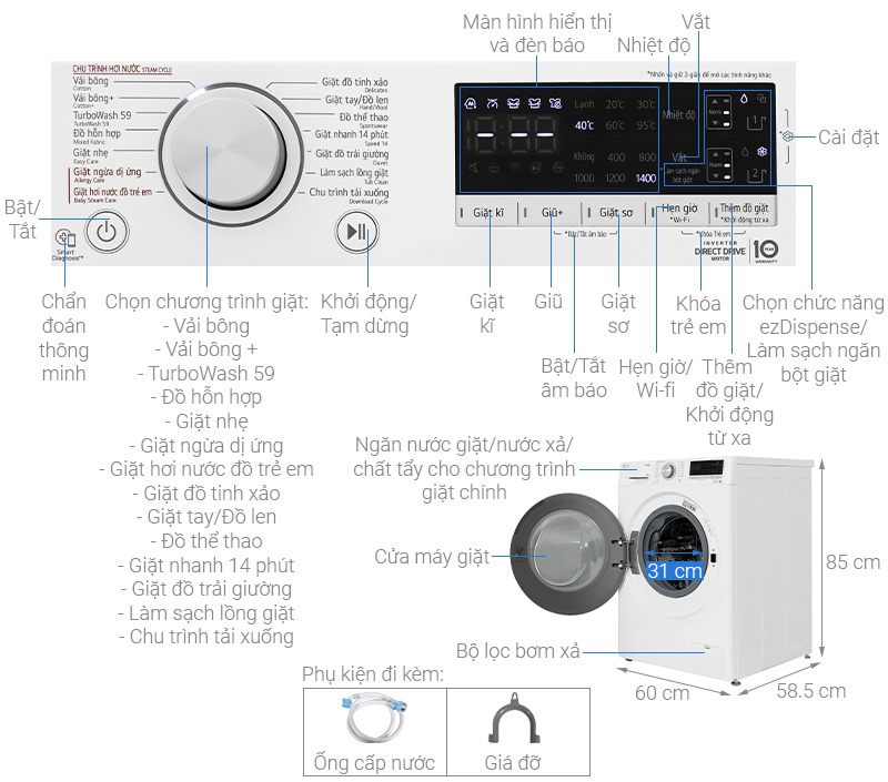 – Đáp ứng nhu cầu sử dụng đa dạng với 14 chương trình giặt sấy như: giặt vải bông, đồ hỗn hợp, đồ tinh xảo, giặt vải bông +, giặt chăn ga, giặt hơi nước đồ trẻ em, giặt tay + đồ len, giặt nhanh 14 phút, giặt TurboWash 59 phút, giặt ngừa dị ứng, giặt nhẹ, đồ thể thao, vệ sinh lồng giặt và chu trình tải về.