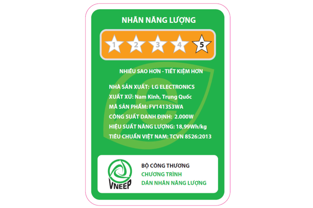 – Nhãn năng lượng chuẩn 5 sao, hiệu suất sử dụng điện là 18.99 Wh/kg.