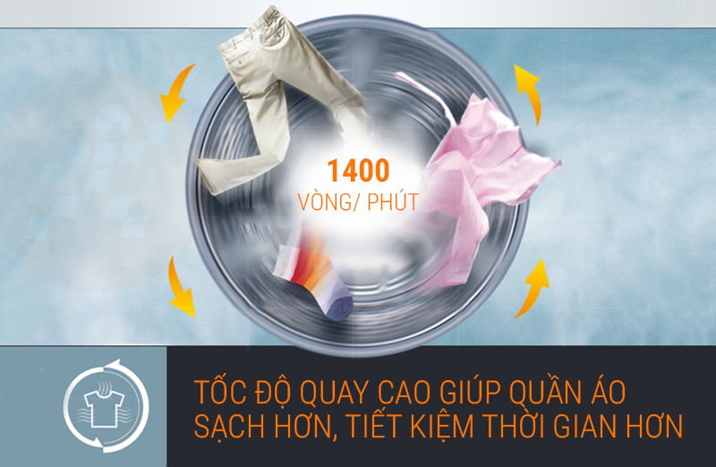 Với tốc độ quay vắt lên đến 1400 vòng/phút, máy giặt LG FC1409S2E sẽ nhanh chóng giặt sạch quần áo mạnh mẽ chỉ trong thời gian ngắn, bạn không phải chờ đợi quá lâu.