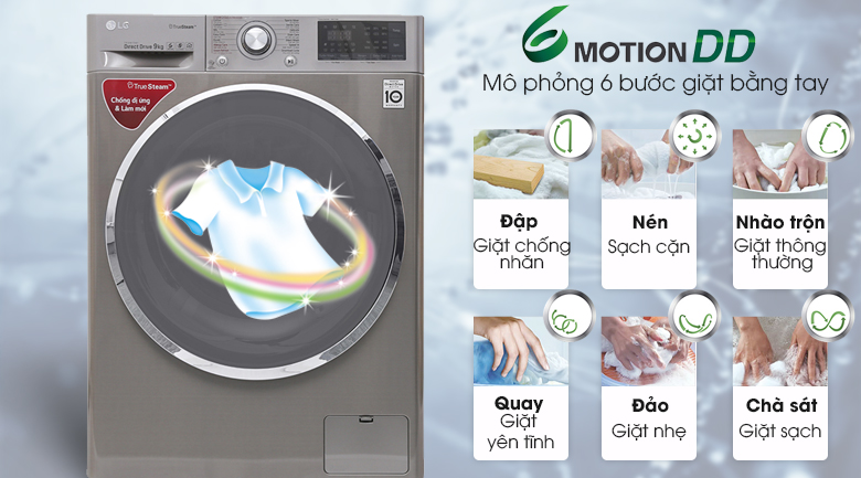 Bên cạnh việc giặt sạch quần áo mạnh mẽ, công nghệ giặt 6 chuyển động mô phỏng theo bàn tay con người của máy giặt sẽ bảo vệ quần áo khỏi nguy cơ bị hư hỏng hay sờn vải, cho quần áo luôn bền đẹp như mới với thời gian.