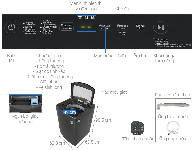 – Với tính năng khóa trẻ em, các phím chức năng sẽ tự khóa khi bật tính năng này lên, giúp tránh tình trạng trẻ thao tác trên bảng điều khiển.