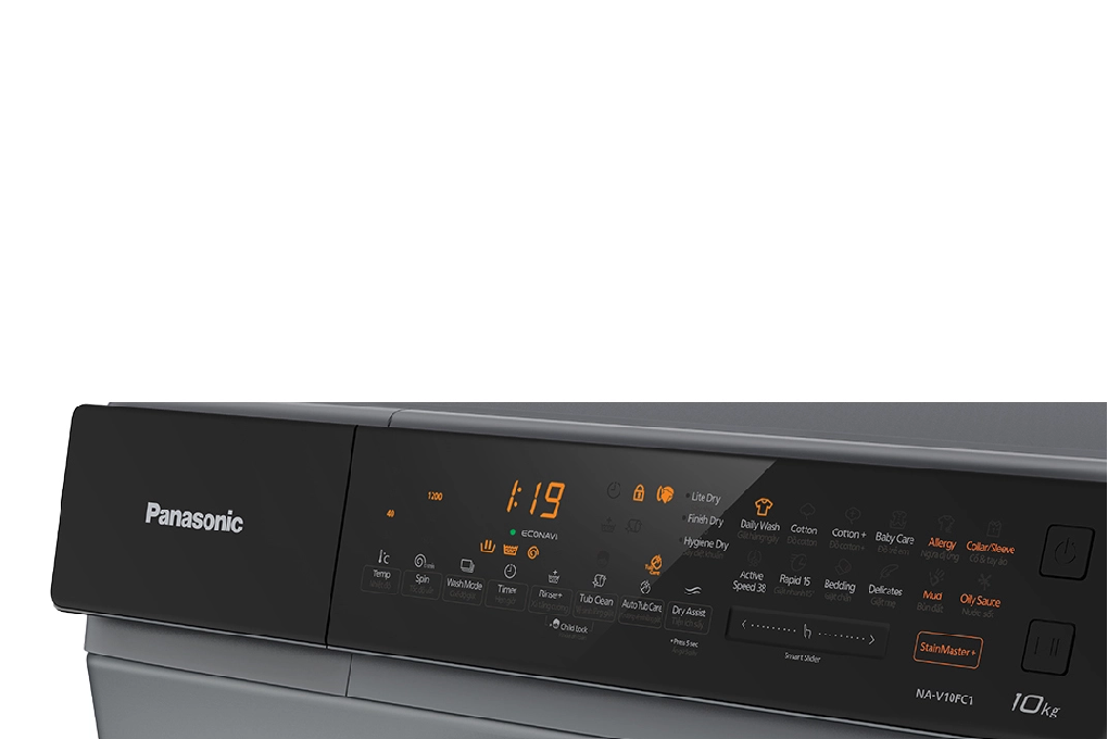Bảng điều khiển được thiết kế ở mặt trước với công tắc trượt/gạt cảm ứng hiện đại. Màn hình hiển thị LED rõ ràng giúp bạn dễ dàng theo dõi và cài đặt chương trình giặt cho máy. Hơn thế, bảng điều khiển sử dụng song ngữ Anh – Việt nên bạn hoàn toàn không cần lo lắng về việc sử dụng máy.